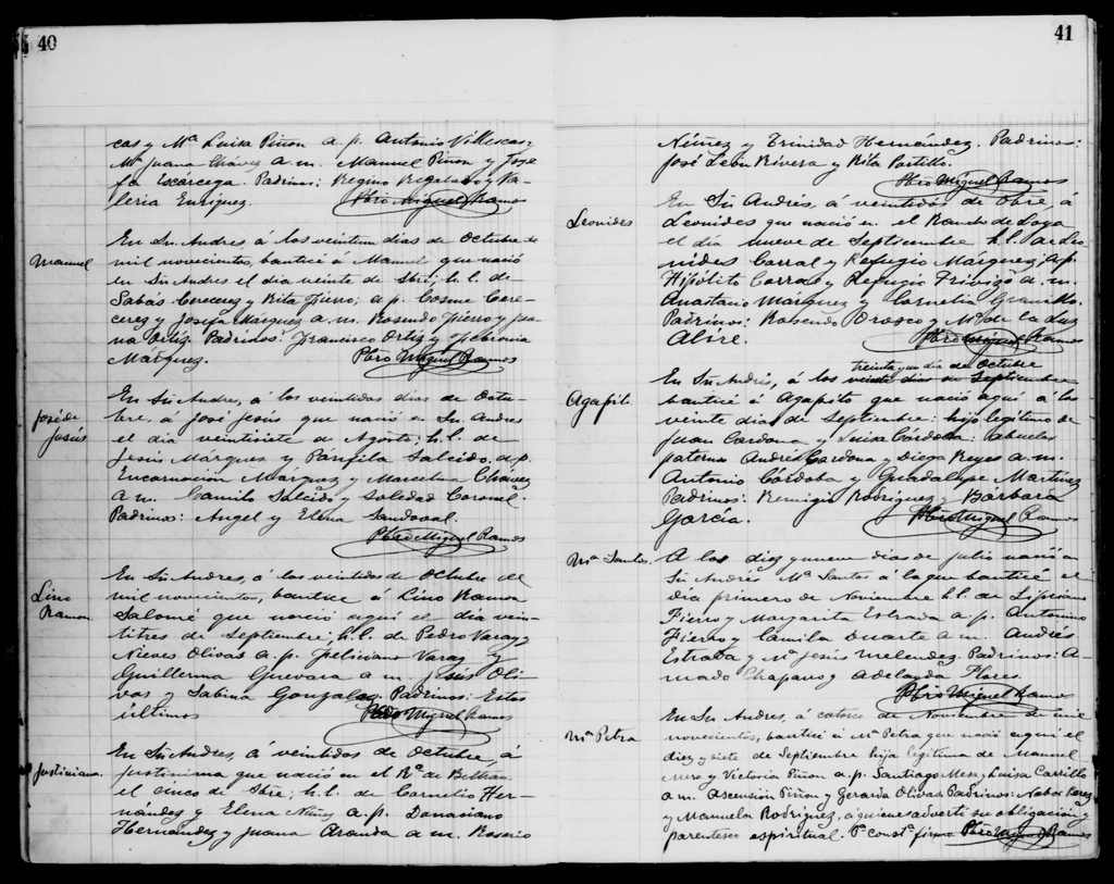 - [S19] Pilot.familysearch.org, Bautizos San Andrés 1899-1905, Bautizo Manuel Cereceres Fierro, página 40.