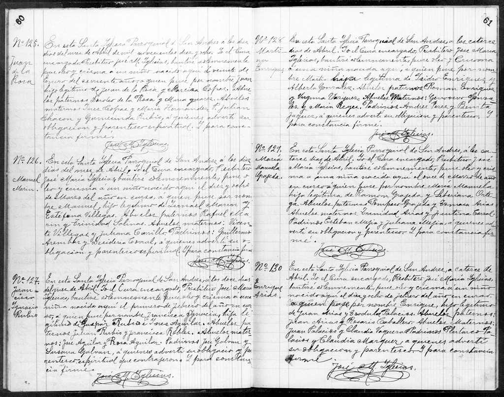 - [S17] Pilot.familysearch.org, Bautizos San Andrés 1894-1899, Bautizo Cosme Cereceres Márquez, página 68, número 24.