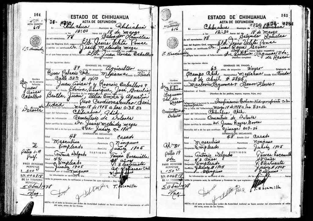 - [S91] Acta de defunción de Juan Arias Caballero, Registro Civil de Chihuahua, Chihuahua, 18 Mar 1978.