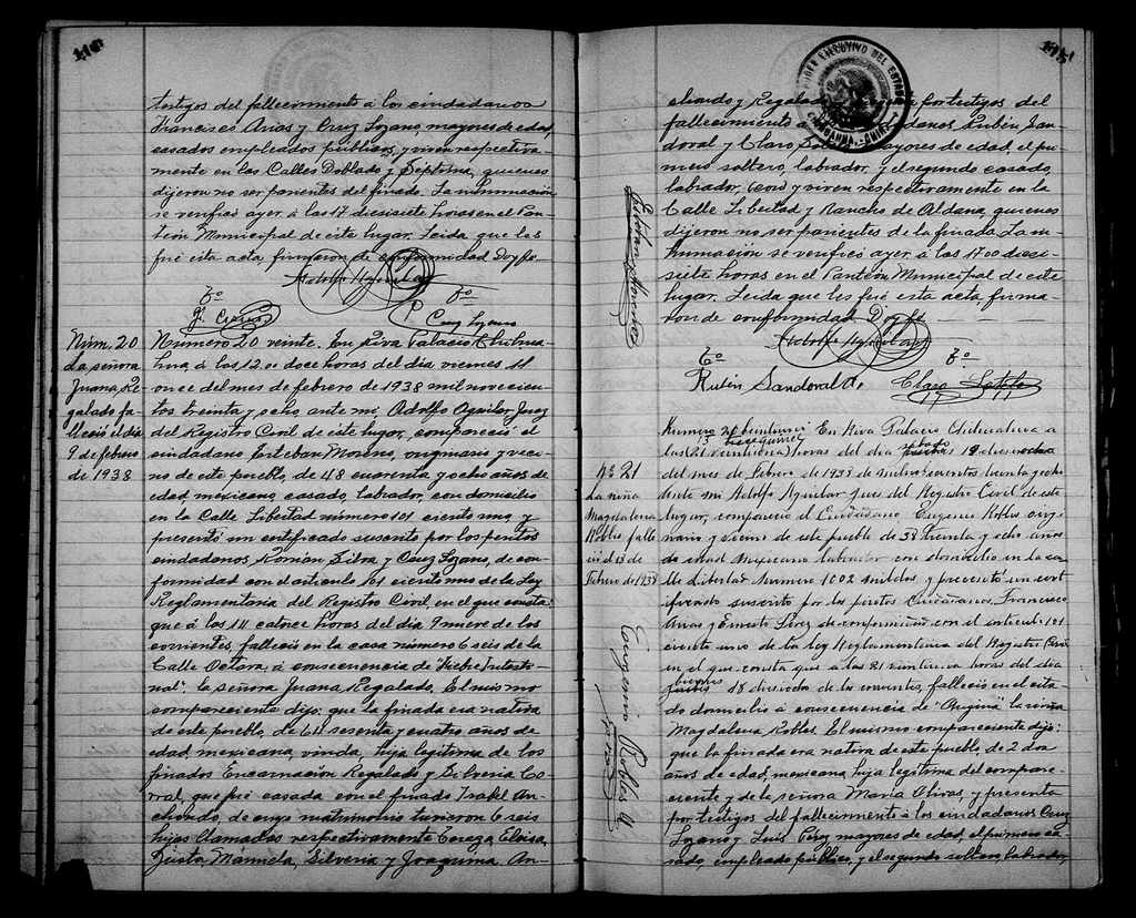- [S110] Acta de defunción de Juana Regalado Corral, Registro Civil de Riva Palacio, Chihuahua, 11 Feb 1938.