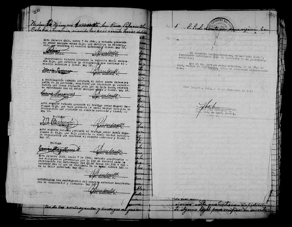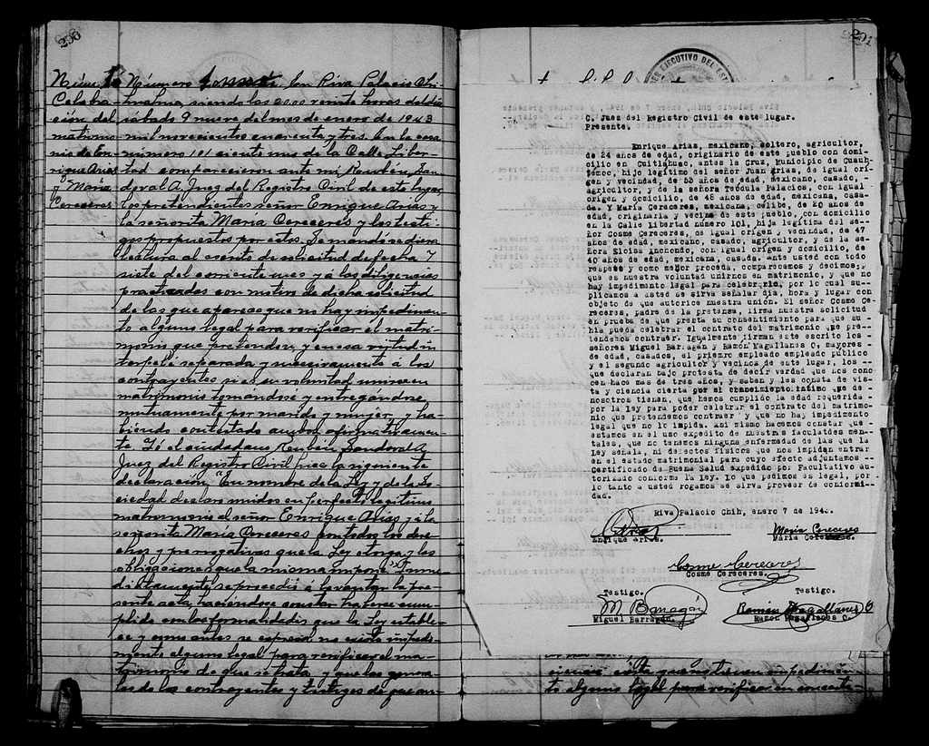 - [S135] Matrimonio civil de Enrique Arias Palacios y María Cereceres Anchondo, Registro Civil de Riva Palacio, Chihuahua, 09 Jan 1943: se casó en 1943 a los 20 años.