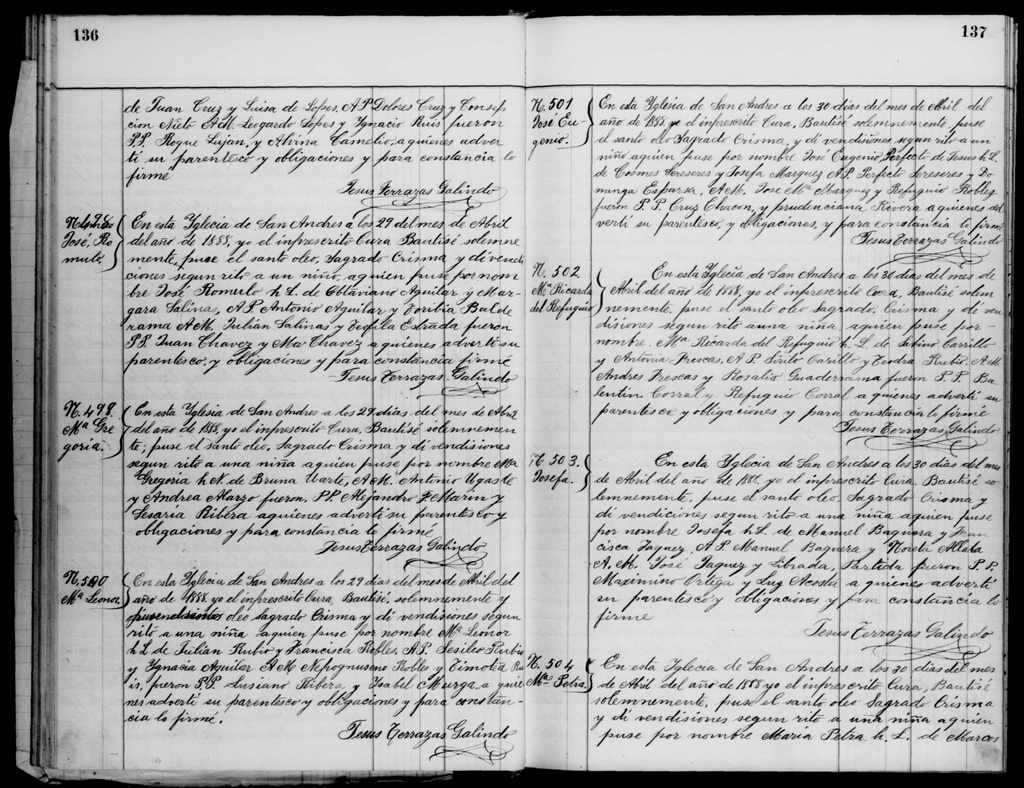 - [S25] Pilot.familysearch.org, Bautizos San Andrés 1883-1889, Bautizo José Eugenio Perfecto de Jesús Cereceres Márquez, hoja 137, número 501.