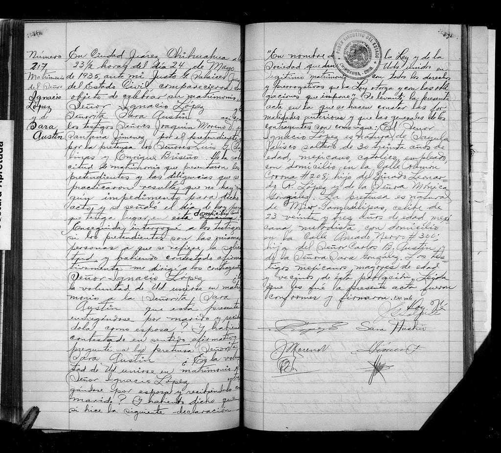 - [S61] Matrimonio civil de Ignacio López y Sara Austin, Registro Civil de Cd. Juárez, Chihuahua, 24 May 1935: página 346.