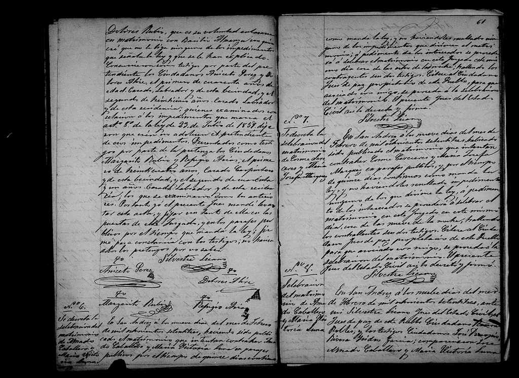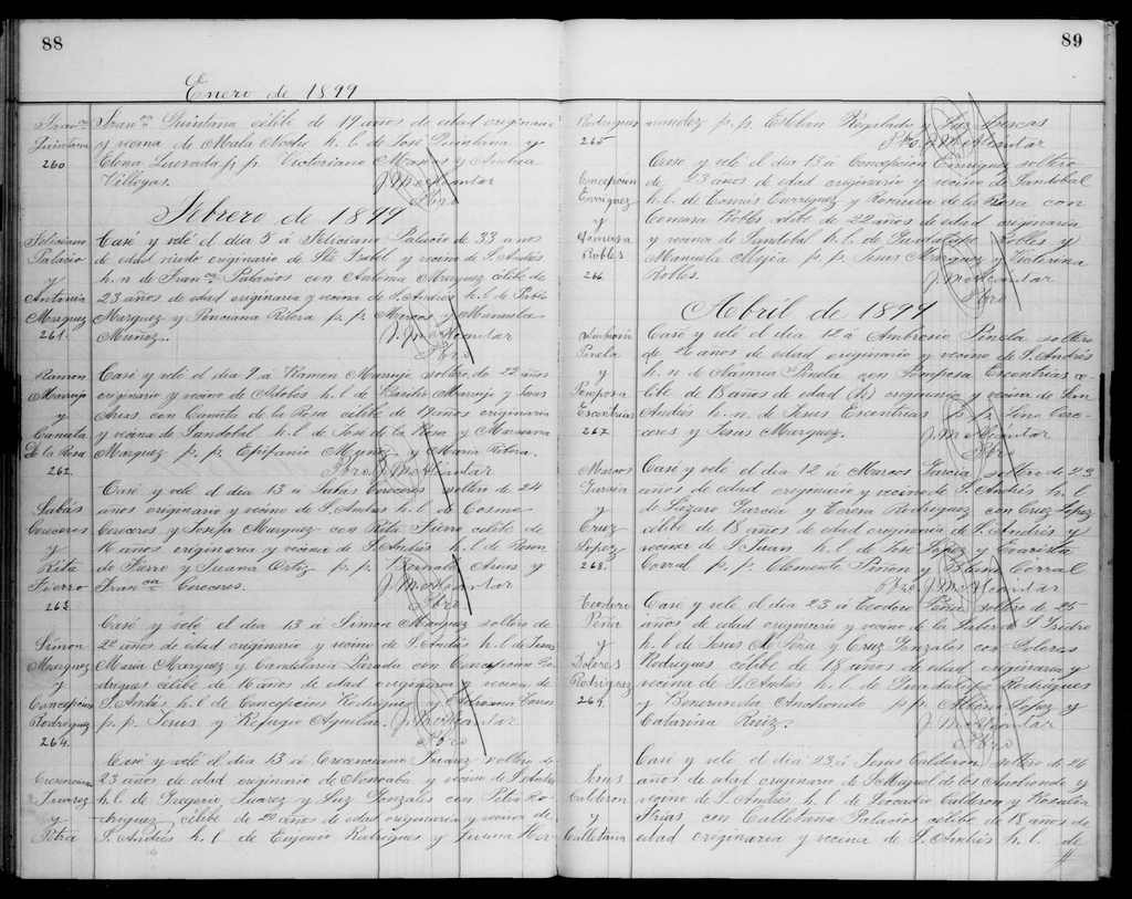 - [S58] Matrimonio de Sixto Mendoza y Dolores Acosta, Parroquia de San Pablo, 28 Feb 1870: el registro de matrimonio menciona la edad (16 años) y el origen (Meoqui).