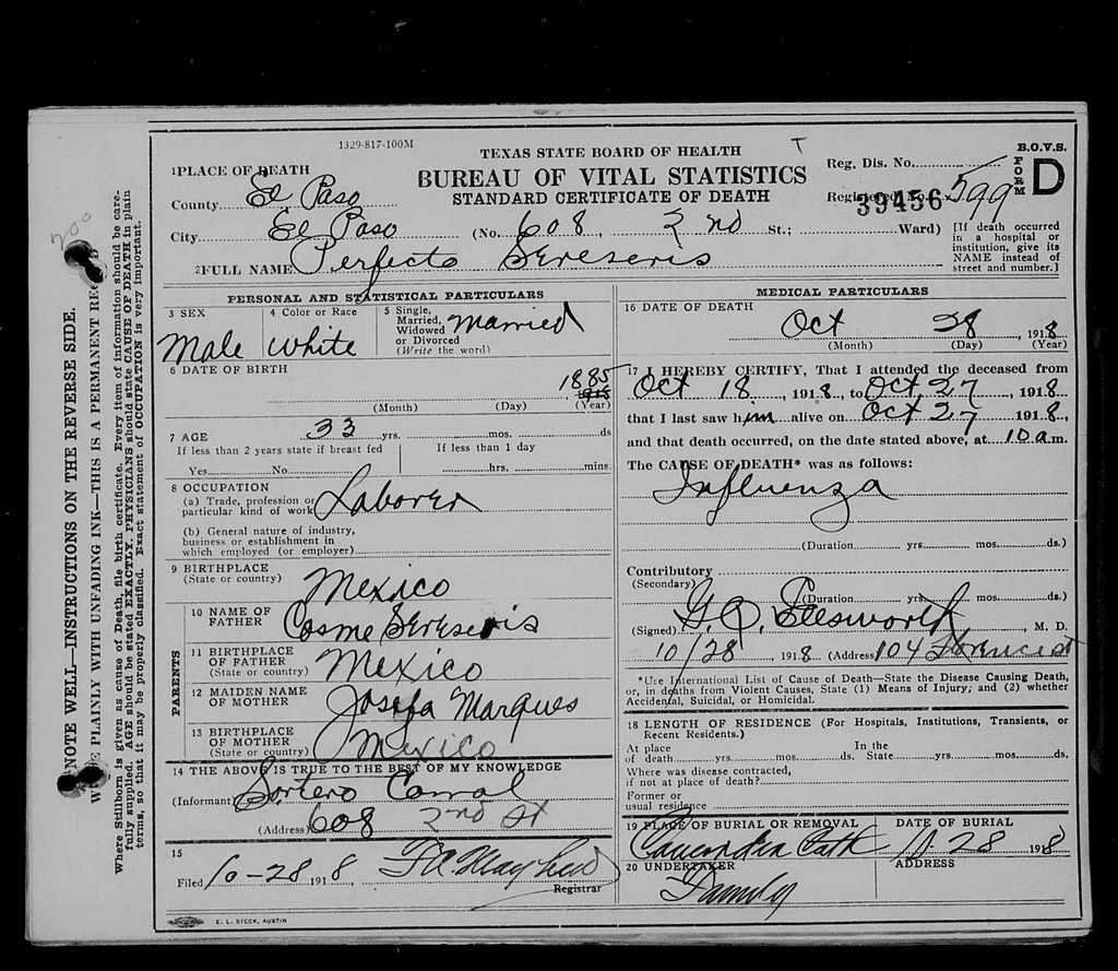 - His son Perfecto Cereceres Márquez died on 28 October 1918 at El Paso, El Paso, Texas, United States; died of influenza.31,16